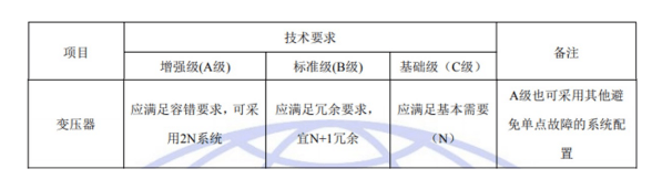 國標(biāo)GB50174-2017《數(shù)據(jù)中心設(shè)計(jì)規(guī)范》中對于A、B、C三級數(shù)據(jù)中心變壓器架構(gòu)的具體要求如下: