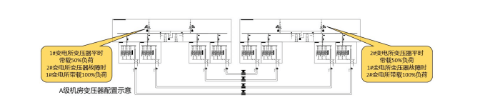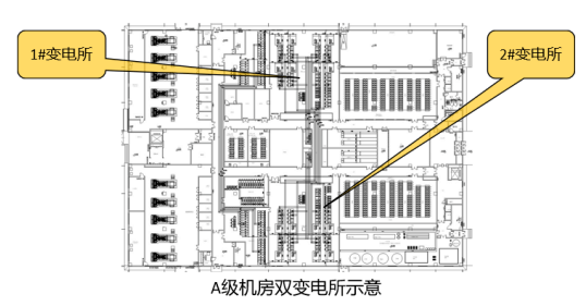 C級、B級機(jī)房無變配電所物理隔離要求;若C級、B級機(jī)房改A級機(jī)房,則每個(gè)變電所之間需做物理隔離。若配電系統(tǒng)采用2N構(gòu)架,則至少需要設(shè)置兩個(gè)物理隔離的變電所,每個(gè)變電所平時(shí)各帶50%負(fù)荷,當(dāng)一個(gè)變電所完全斷電時(shí),另一個(gè)變電所帶載100%負(fù)荷。若配電系統(tǒng)采用2+1的DR構(gòu)架,則至少需要設(shè)置三個(gè)物理隔離的變電所,每個(gè)變電所平時(shí)各帶66%負(fù)荷,當(dāng)其中一個(gè)變電所完全斷電時(shí),另兩個(gè)變電所帶載100%負(fù)荷。