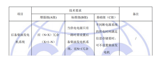 國標(biāo)GB50174-2017《數(shù)據(jù)中心設(shè)計(jì)規(guī)范》中對于A、B、C三級數(shù)據(jù)中心后備柴油發(fā)電機(jī)系統(tǒng)的具體要求如下: