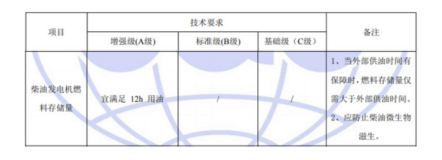 國標(biāo)GB50174-2017《數(shù)據(jù)中心設(shè)計(jì)規(guī)范》中對于A、B、C三級數(shù)據(jù)中心后備柴油發(fā)電機(jī)燃料存儲系統(tǒng)的具體要求如下: