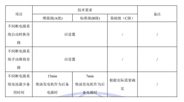 國標(biāo)GB50174-2017《數(shù)據(jù)中心設(shè)計(jì)規(guī)范》中對于A、B、C三級數(shù)據(jù)中心不間斷電源系統(tǒng)旁路及備用時(shí)間的具體要求如下: