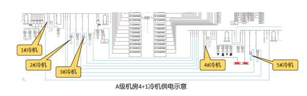 C級機(jī)房無冷機(jī)末端切換要求;若C級機(jī)房改B級、A級機(jī)房,則部分冷機(jī)需做末端互投,以保證在一個(gè)變電所完全斷電時(shí),另一個(gè)變電所可以帶載滿足機(jī)房冷卻工況的全部冷機(jī)。