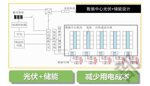 項(xiàng)目可根據(jù)當(dāng)?shù)厍闆r增加光伏儲能一體化設(shè)備,光伏、谷電、平電為儲能系統(tǒng)充電,峰電時(shí)段儲能系統(tǒng)放電,減少機(jī)房用電成本。