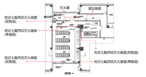 3)柜式七氟丙烷氣體滅火裝置可按保護(hù)半徑不大于7.5m布置。可將總需要柜數(shù)按保護(hù)距離均布。