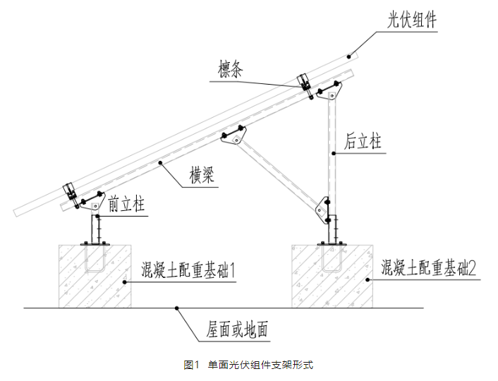該支架體系由前后兩根立柱支撐一根橫梁,沿橫梁縱向搭設(shè)檁條,檁條之上通過(guò)壓塊將組件固定。該體系通過(guò)前后立柱的混凝土配重墩固定在屋面或者地面上。結(jié)構(gòu)橫向由斜撐形成固定體系,縱向由混凝土基礎(chǔ)和檁條形成固定體系。經(jīng)眾多實(shí)際項(xiàng)目驗(yàn)證,該結(jié)構(gòu)體系能滿足光伏使用的結(jié)構(gòu)安全需要。