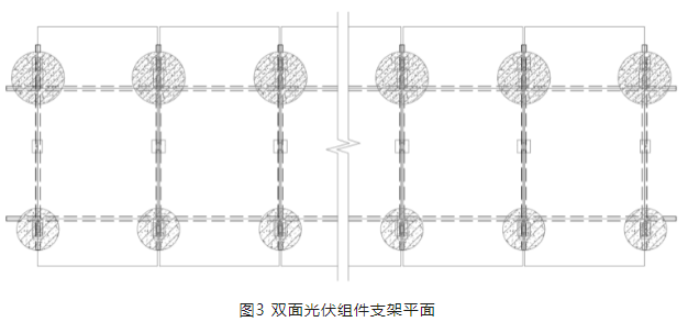 由于雙面光伏組件背后不宜有遮擋,因此雙面光伏組件不適合采用立柱“橫梁+檁條”的結(jié)構(gòu)體系。因此,可將檁條取消,將光伏組件直接連接到兩側(cè)的橫梁上,如圖3所示。