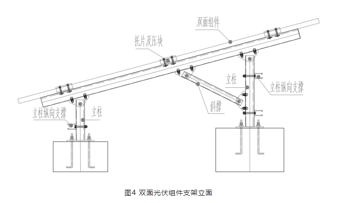 每塊光伏組件兩側(cè)均設(shè)置橫梁,組件通過(guò)壓塊和托片固定到橫梁上,橫梁通過(guò)前后立柱固定到基礎(chǔ)上。為了保證結(jié)構(gòu)側(cè)向的穩(wěn)定,前立柱沿縱向設(shè)置一根縱向支撐,后立柱沿縱向設(shè)置兩根縱向支撐,雙面光伏組件支架立面如圖4所示。該支架結(jié)構(gòu)體系取消縱向檁條,有效的避免了其對(duì)組件背面的遮擋。同時(shí)立柱設(shè)置的縱向支撐,提供了支架縱向的剛度,使支架在縱向形成穩(wěn)定的支架體系。具體安裝效果詳見(jiàn)第7節(jié)應(yīng)用案例。