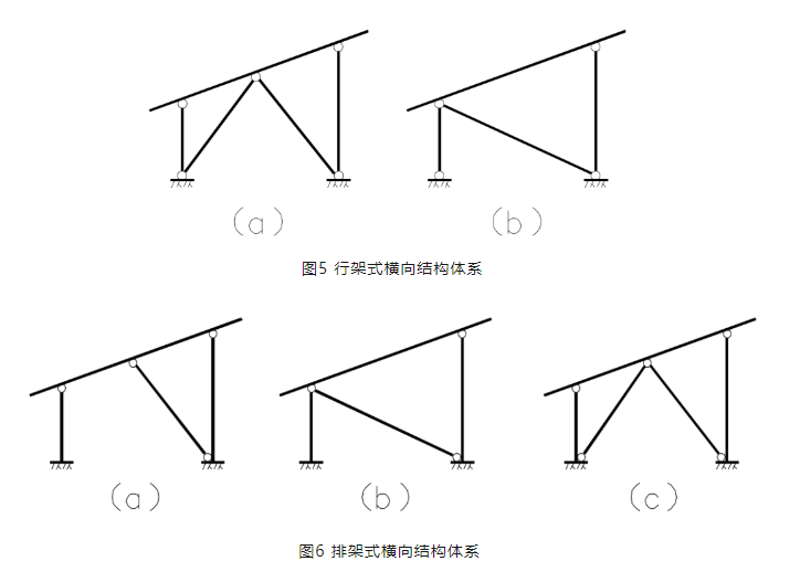 圖4所示支架橫向結(jié)構(gòu)可根據(jù)立柱與基礎(chǔ)連接形式的不同,分為兩種結(jié)構(gòu)體系,柱底鉸接和柱底固結(jié)的形式。柱底鉸接形式為行架式橫向結(jié)構(gòu)體系,柱底固結(jié)為排架式橫向結(jié)構(gòu)體系。圖5所示兩種形式均為行架式橫向結(jié)構(gòu)體系,該結(jié)構(gòu)體系前后立柱與基礎(chǔ)采用鉸接的形式,并且采用一根或者兩根橫向支撐提供側(cè)向剛度,形成穩(wěn)定的結(jié)構(gòu)不變體系。圖6所示三種形式均為排架式橫向結(jié)構(gòu)體系,該結(jié)構(gòu)體系前后立柱與基礎(chǔ)采用固結(jié)的形式,并且采用一根或兩根縱向支撐提供側(cè)向剛度,增強(qiáng)結(jié)構(gòu)的抗側(cè)力穩(wěn)定性。基礎(chǔ)設(shè)計(jì)同傳統(tǒng)光伏支架。