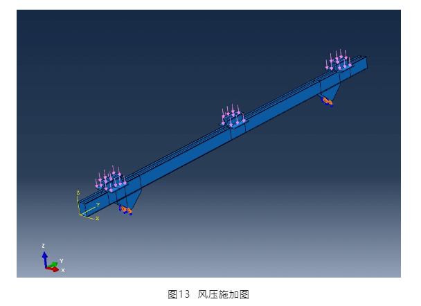 為驗(yàn)證壓塊與橫梁節(jié)點(diǎn)部位的受力,取一根橫梁采用三維應(yīng)力單元進(jìn)行仿真分析。風(fēng)荷載施加到壓塊上,通過(guò)壓塊傳遞給橫梁,三角連接件底部設(shè)置固定支座,見(jiàn)圖13,橫梁通過(guò)三角支座固定。
