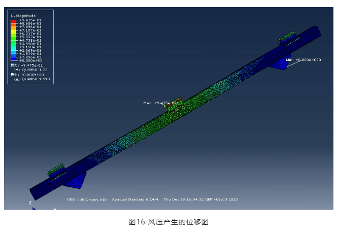 從圖16可以看出,風(fēng)壓產(chǎn)生的最大位移為0.95mm(特別指出該位移與圖11、12所示位移不同,是因?yàn)楹奢d施加方式不同,圖11及圖12僅為驗(yàn)證結(jié)構(gòu)體系整體穩(wěn)定性,因此荷載采取沿橫梁施加線荷載的方式),橫梁截面無(wú)翹曲,因此,該創(chuàng)新壓塊節(jié)點(diǎn)滿足強(qiáng)度要求。