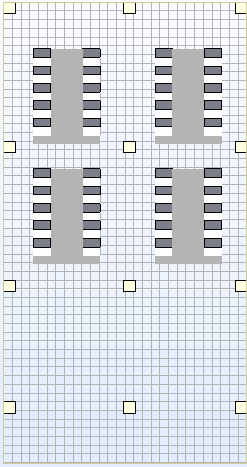 根據設計方案部署4個相同的雙排微模塊,每個微模塊分別部署10(8+2)臺列間級精密空調,共40(32+8)臺。列間級精密空調單機冷量:35kW;額定風量:8000m³/h;空調設備控制22℃送風,35℃回風;空調背面回風,正面出風;數量總計40臺。每座微模塊默認位置共10架IT機架,IT機架負載25kW /rack ,機房總計40架IT機架;微模塊封閉冷通道,冷通道寬1.8m。該方案布置方案如下圖: