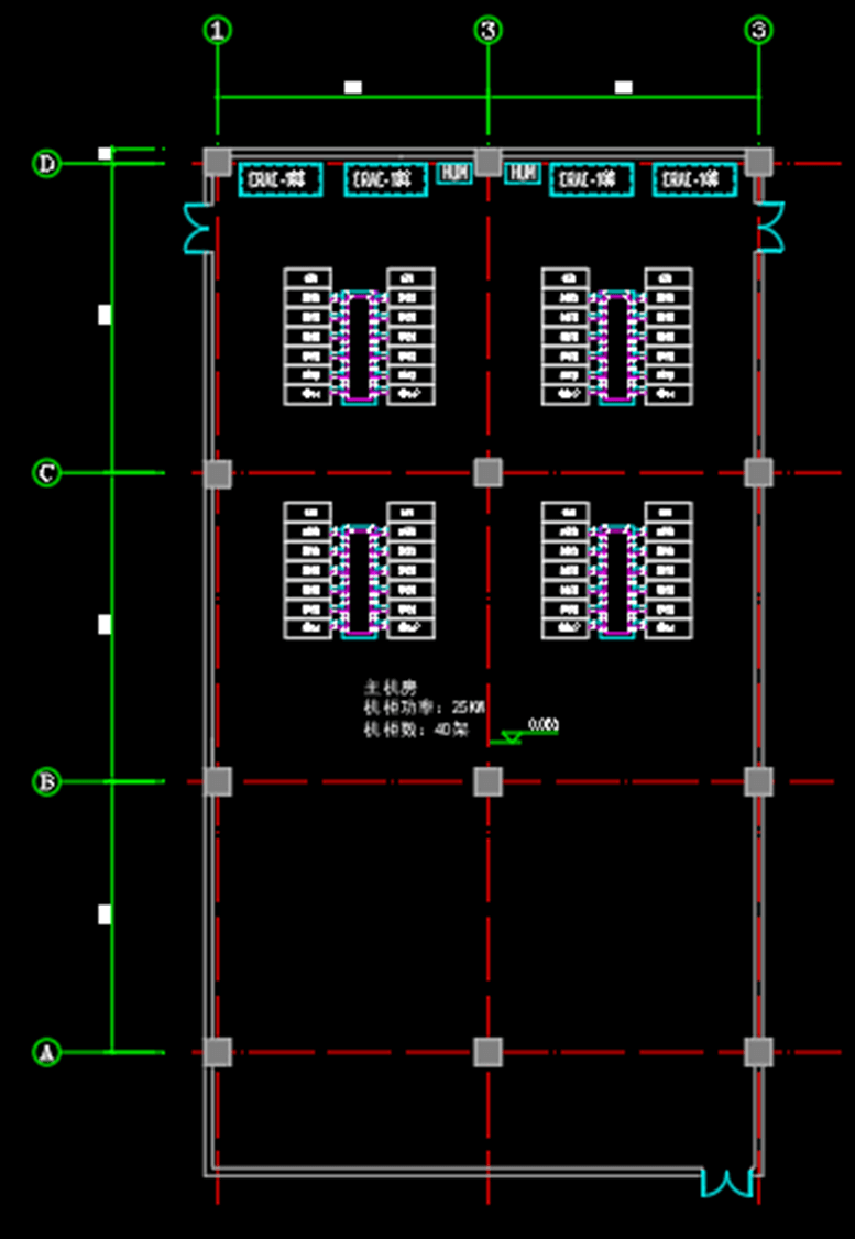 根據(jù)設(shè)計方案部署4個相同的雙排微模塊,并在每個機柜處增加2根分集水器manifold(支路數(shù)根據(jù)服務(wù)器數(shù)量確定),機柜底部開孔,并在安裝manifold的一邊側(cè)板上增加固定件及孔位,機房設(shè)置靜電地板,凈空高度建議不少于600mm。該方案布置方案如下圖: