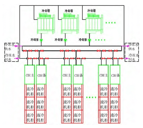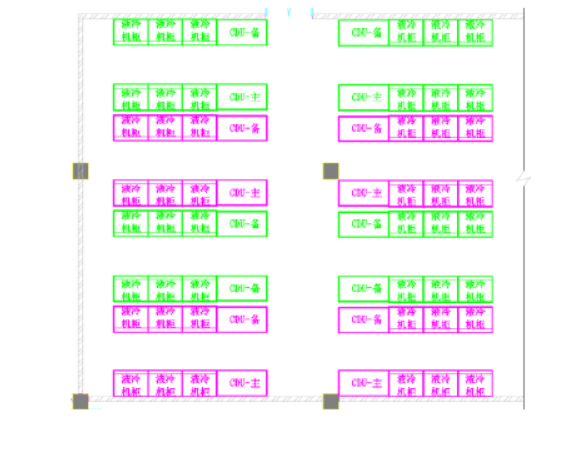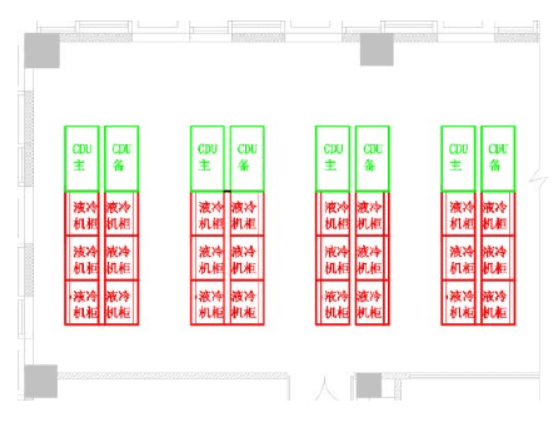 3)將CDU集中布置到一個(gè)區(qū)域或者集中到幾個(gè)有序區(qū)域,使液冷設(shè)備管路和冷卻水管路有明確的物理分區(qū),一方面可以使各功能區(qū)有序布局,另一方面能夠更加簡潔的實(shí)現(xiàn)冷卻水管路和閥門冗余設(shè)計(jì)。