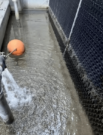 開式塔在常規(guī)冷凍水系統(tǒng)中使用較普遍,優(yōu)點(diǎn)之一價(jià)格較低。其次,開式塔系統(tǒng)簡潔,不需要閉式系統(tǒng)的定壓裝置,沒有噴淋泵,無需添加乙二醇防凍,運(yùn)行維護(hù)簡單。且同等工況下設(shè)備功率低,甚至可以選擇一些無風(fēng)機(jī)冷卻塔來搭配運(yùn)行,可以把PUE降到極致。但開式塔最大的缺點(diǎn)就是循環(huán)水與外界環(huán)境直接接觸,需重點(diǎn)關(guān)注水質(zhì)處理,目前開式塔系統(tǒng)水質(zhì)控制好和壞的案例均存在,一方面是水處理廠家參差不齊的原因,另一方面是碳鋼管道自身在開式系統(tǒng)中容易腐蝕。筆者有幸參與開式塔系統(tǒng)水質(zhì)控制良好的項(xiàng)目,見圖 8水質(zhì)清澈良好。具體措施為采用鍍鋅管道法蘭連接,而非采用碳鋼管道外表面刷防銹漆的方式,采用鍍鋅管道的系統(tǒng),日常運(yùn)行只需要應(yīng)對(duì)結(jié)垢和夏季藻類細(xì)菌滋生的問題,水處理的成本大幅降低。且使用鍍鋅管道造成的成本增加不到管路成本的10%,完全可以從水處理減少的費(fèi)用中來覆蓋這部分增加。通過如上措施,不但能節(jié)約成本,還能良好的控制水質(zhì),以及減少水處理化學(xué)品的使用。