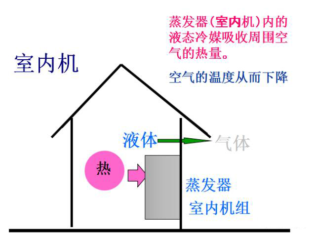 室內的溫度較高,空氣流過蒸發器時冷媒蒸發帶走空氣種的熱量,空氣溫度降低成為冷空氣。
