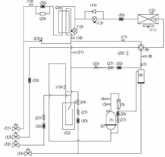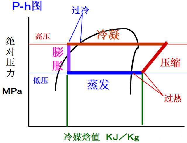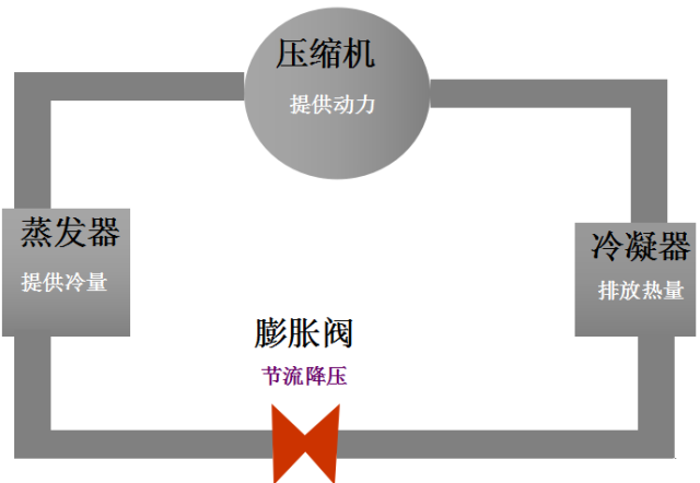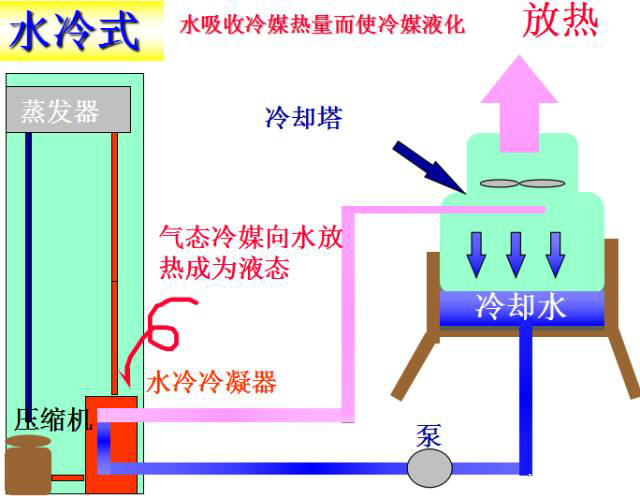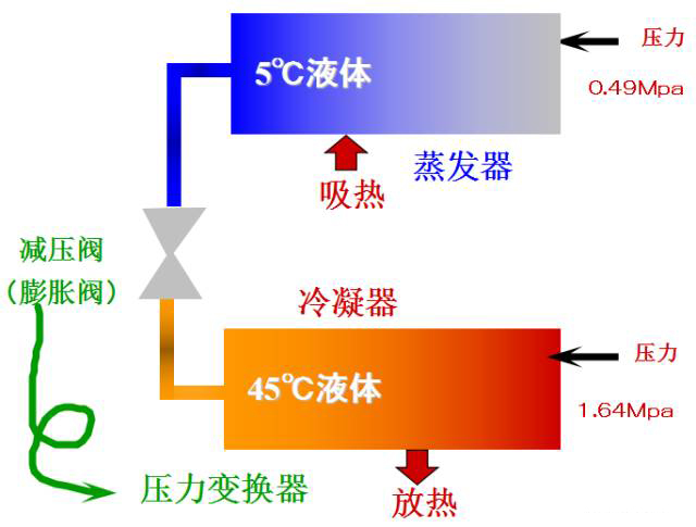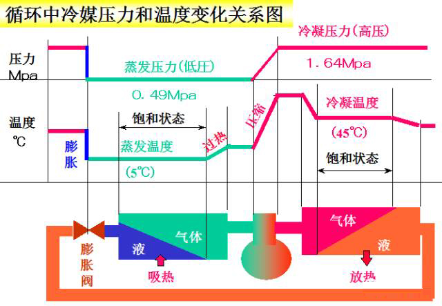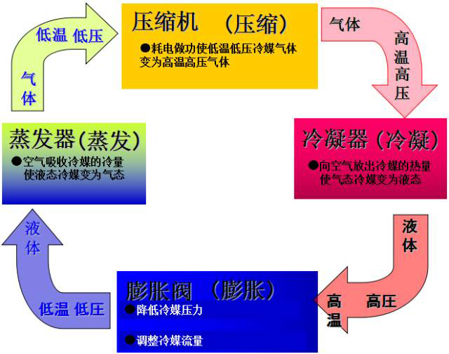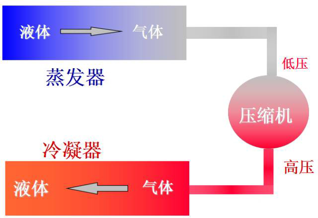 來自蒸發器的低溫低壓的冷媒氣體被壓縮機壓縮成高溫高壓的氣體進入冷凝器