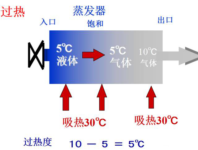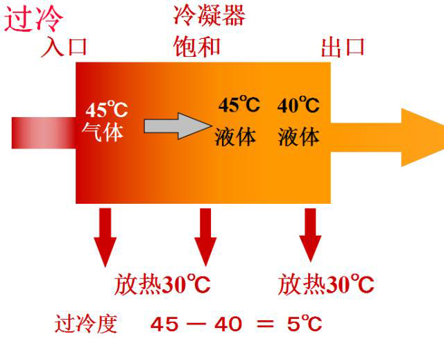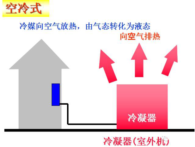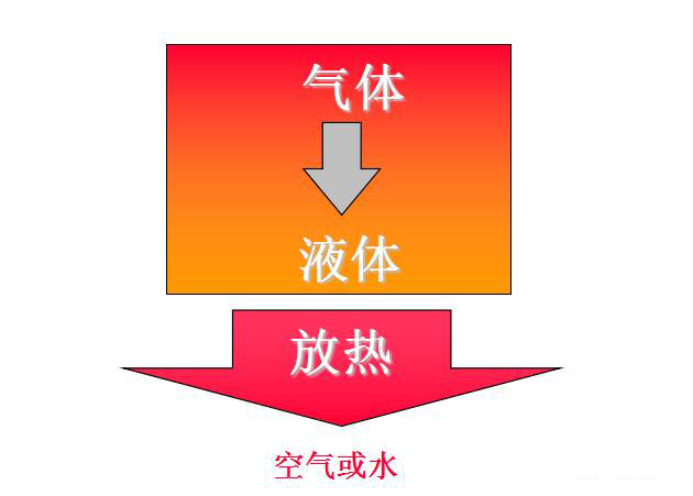 氣態的冷媒向周圍的空氣或水放熱,氣態冷媒液化為液體