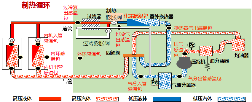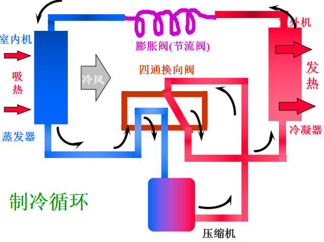 制熱原理與制冷原理基本相同,不同的是通過電路系統控制電磁四通閥中的閥塊進行換向,從而改變制冷劑的流向,實現制冷到制熱功能的轉換。