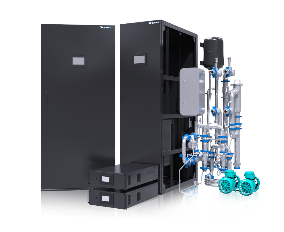 集成板式換熱器、雙循環泵組(1+1冗余)、智能定壓補液系統及多維度傳感器網絡,通過PLC控制系統實現流量/溫度/壓力的毫秒級精準調節。支持與機房管理系統聯動智能尋優,保障冷卻液溫差≤±0.5℃,COP>100。