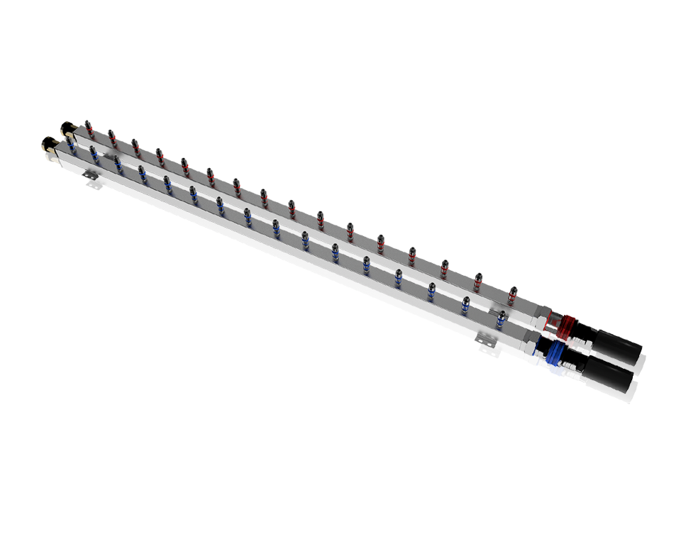 Manifold主要用于機柜內各液冷設備之間的冷卻介質分配,有耐腐蝕、強度高、易拓展等特點。根據使用需求,有單管和雙排管之分,單管主要用于手插連接,雙排管用于百插連接,雙排管之間為焊接連接,兩管路位置精度+0.15mm,屬于超精密制造。